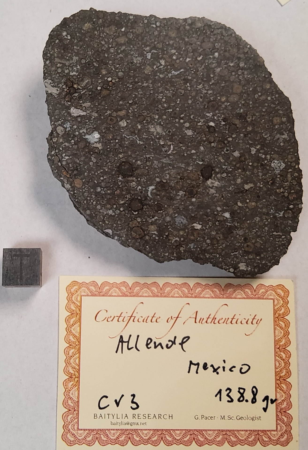 A large shower of stones fell after a huge fireball lighted up thousands of square miles of Northern Mexico, reported, Met. Bull. 45, Meteoritics, 1970, 5, p.101. More than 2000kg were probably collected. One individual weighed 100-110kg but had fragmented on impact. The strewn field is estimated to be more than 150 sq.km, E.A.King et al., Science, 1969, 163, p.928. Full, illustrated description of individual specimens, bulk and mineral analyses, 23.85% total Fe, olivine Fa0-45, avg. Fa6 in chondrules, R.S.Clarke,Jr. et al., Smithson. Contrib. Earth Sci., 1970, (5); see also, D.P.Elston, Meteoritics, 1970, 5, p.195; R.S.Clarke,Jr., Meteoritics, 1970, 5, p.189; R.M.Housley and M.Blander, Meteoritics, 1970, 5, p.203. Reference sample preparation, comparative analyses, E.Jarosewich et al., Smithson. Contrib. Earth Sci., 1987, (27). Noble gas data, gas-retention ages, E.L.Fireman et al., GCA, 1970, 34, p.873. Contains organic material, R.L.Levy et al., Nature, 1970, 227, p.148. Contains hibonite, K.Keil and L.H.Fuchs, Earth Planet. Sci. Lett., 1971, 12, p.184. Total carbon and nitrogen contents, E.K.Gibson et al., GCA, 1971, 35, p.599. XRF analysis, T.S.McCarthy and L.H.Ahrens, Earth Planet. Sci. Lett., 1972, 14, p.97. Uranium content, D.E.Fisher, GCA, 1972, 36, p.15. Oxygen isotopes in separated phases, N.Onuna et al., GCA, 1972, 36, p.169. Bi abundance, P.M.Santoliquido and W.D.Ehmann, GCA, 1972, 36, p.897. Xe and Kr isotope data, O.K.Manuel et al., GCA, 1972, 36, p.961. Refractory trace elements in CAIs, L.Grossman, GCA, 1973, 37, p.1119. Concentrations of heavy elements, H.Hintenberger et al., Meteoritics, 1973, 8, p.380 (abs.). Rb-Sr data, C.M.Gray et al., Icarus, 1973, 20, p.213. Major and trace element composition of chondrules and CAIs, P.M.Martin and B.Mason, Nature, 1974, 249, p.333. Mg isotopic composition, C.M.Gray and W.Compston, Nature, 251, p.495. Elemental abundances in chondrules, T.W.Osborne et al., GCA, 1974, 38, p.1359. Alkali element abundances, W.Nichiporuk and C.B.Moore, GCA, 1974, 38, p.1691. Grossular in inclusions, L.H.Fuchs, Meteoritics, 1974, 9, p.11. Mg isotopic anomalies in inclusions, T.Lee and D.A.Papanastassiou, Geophys. Res. Lett., 1974, 1, p.225. Chondrule composition, A.L.Graham, Smithson. Contrib. Earth Sci., 1975, (14), p.35. Petrography and mineral chemistry of CAIs, L.Grossman, GCA, 1975, 39, p.433. Refractory element pattern in CAIs, W.V.Boynton, GCA, 1975, 39, p.569. Evidence for a liquid origin of CAIs, M.Blander and L.H.Fuchs, GCA, 1975, 39, p.1605. SEM study of pink CAI, L.Grossman et al., Geophys. Res. Lett., 1975, 2, p.37. Study of Fremdlinge in CAIs, H.Palme et al., Earth Planet. Sci. Lett., 1976, 33, p.45; see also, D.A.Wark and J.F.Lovering, LPSC, 1976, 7, p.912 (abs.). Volatile element distribution in CAIs, C.-L.Chou et al., GCA, 1976, 40, p.85. Study of amoeboid olivine aggregates, L.Grossman and I.M.Steele, GCA, 1976, 40, p.149. Trace element analysis of coarse-grained, Ca-rich inclusions, L.Grossman and R.Ganapathy, GCA, 1976, 40, p.331. U-Th-Pb systematics of inclusions, M.Tatsumoto et al., GCA, 1976, 40, p.617. U-Pb isotopic composition, J.H.Chen and G.R.Tilton, GCA, 1976, 40, p.635. Trace element contents of fine-grained, Ca-rich inclusions, L.Grossman and R.Ganapathy, GCA, 1976, 40, p.967. Ba isotopic composition, M.T.McCulloch et al., Meteoritics, 1976, 11, p.331 (abs.). Four different groups of inclusions present, geochemical differences among groups, B.Mason and P.M.Martin, Smithson. Contrib. Earth Sci., 1977, (19), p.84. Xe isotopes in sulfides, R.S.Lewis, Meteoritics, 1977, 12, p.292 (abs.). Fluorine content, R.O.Allen,Jr. and P.J.Clark, GCA, 1977, 41, p.581. He and Ne isotopes in CAIs, chondrules, bulk and matrix, S.P.Smith et al., GCA, 1977, 41, p.627. Te content, C.L.Smith et al., GCA, 1977, 41, p.676. Chemical composition of matrix material, H.Y.McSween,Jr., GCA, 1977, 41, p.1145. Molybdenite observed in CAIs, L.H.Fuchs and M.Blander, GCA, 1977, 41, p.1170. Mg and Ca isotopic composition of spinel, melilite and anorthite, T.Lee et al., GCA, 1977, 41, p.1473. Trace element distribution in mineral separates, H.Nagasawa et al., GCA, 1977, 41, p.1587. Yb content, M.T.McCulloch et al., GCA, 1977, 41, p.1703. Trace element abundances in coarse-grained inclusions, L.Grossman et al., GCA, 1977, 41, p.1647. Sulfur isotopic composition, S-33 anomaly, C.E.Rees and H.G.Thode, GCA, 1977, 41, p.1679. Member of oxidized subgroup of CV3, olivine Fa10.0, PMD 86, H.Y.McSween,Jr., GCA, 1977, 41, p.1777. Oxygen isotopic anomalies found in CAIs, R.N.Clayton and T.K.Mayeda, Geophys. Res. Lett., 1977, 4, p.295. Mg isotopic anomalies found in CAIs, G.J.Wasserburg et al., Geophys. Res. Lett., 1977, 4, p.299. Oxygen isotopic composition of CAIs, R.N.Clayton et al., Earth Planet. Sci. Lett., 1977, 34, p.209. SEM study of Fremdlinge, A.El Goresy et al., Proc. LPSC, 1978, 9, p.1279. Analysis of Ti-bearing fassaites, S.E.Haggerty, Nature, 1978, 276, p.221. Trace element data, H.Takahashi et al., GCA, 1978, 42, p.97. Noble gas data, B.Srinivasan et al., GCA, 1978, 42, p.183. High temperature heating experiments, K.Notsu et al., GCA, 1978, 42, p.903 (abs.). Exposure age based on spallogenic Mn-53 contents, P.Englert and W.Herr, GCA, 1978, 42, p.1635. Grain size distribution, T.V.V.King and E.A.King, Meteoritics, 1978, 13, p.47. Mineralogy of rhönite-bearing CAI, L.H.Fuchs, Meteoritics, 1978, 13, p.73. Infrared photometry, albedo, JHK colors, M.Leake et al., Meteoritics, 1978, 13, p.101. Thermal release profile of Zn, E.H.Cirlin and R.M.Housley, Meteoritics, 1978, 13, p.413 (abs.). UV reflectance spectra, A.J.Cohen et al., Meteoritics, 1978, 13, p.420 (abs.). Major and trace element abundances in awaruite and pentlandite, A.M.Davis et al., Meteoritics, 1978, 13, p.438 (abs.). Mg isotopic composition of inclusions, I.D.Hutcheon et al., Meteoritics, 1978, 13, p.498 (abs.). Magnetic properties of chondrules, remanence, M.Lanoix et al., Geophys. Res. Lett., 197